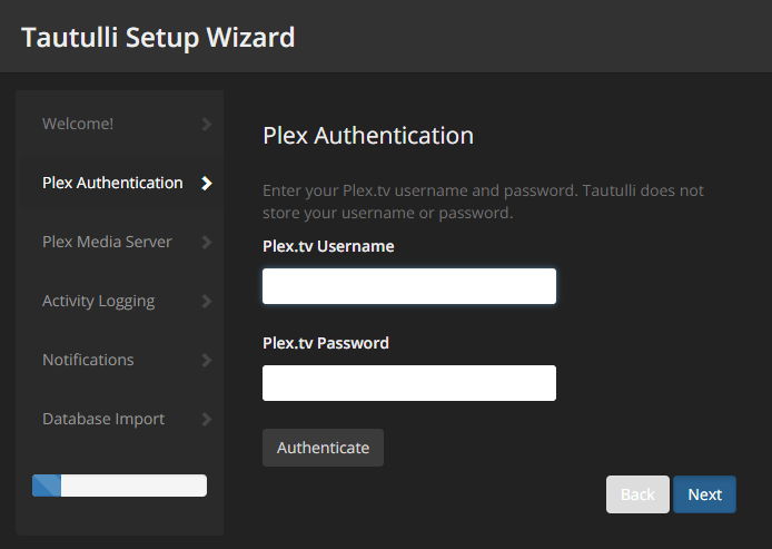 On the "Plex Authentication" page, sign in with your Plex username and password, and click